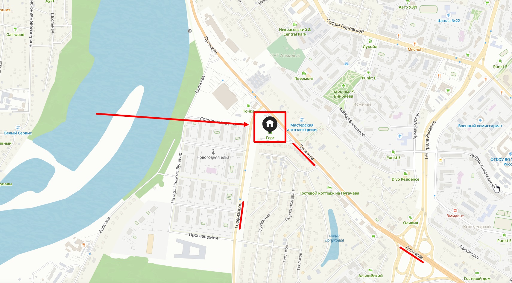 ЖК Геос находится в Кузнецовском Затоне по ул. Геофизиков, в 10-ти минутах от центра на транспорте. Рядом находится круглосуточная "Лента", так же аптеки, "К&Б", кафе, салоны красоты, школа, детский сад.